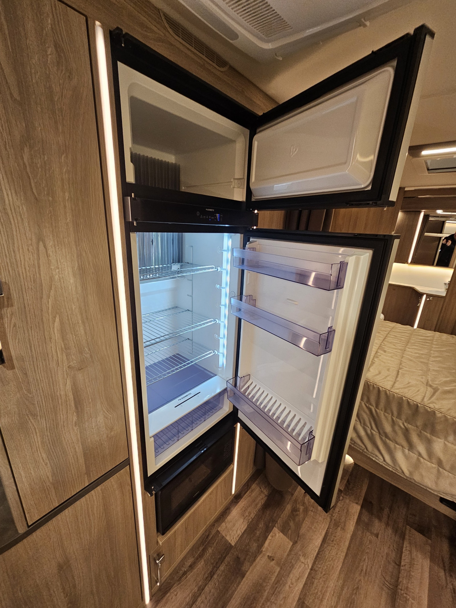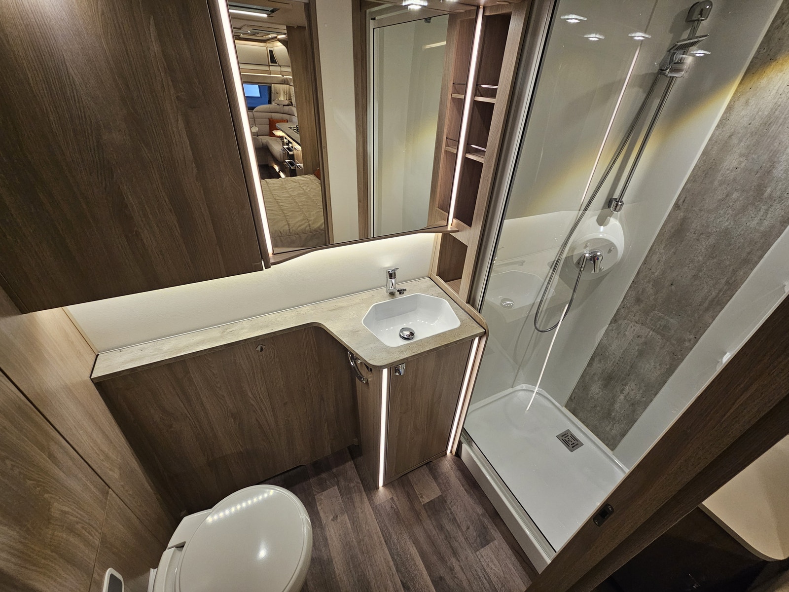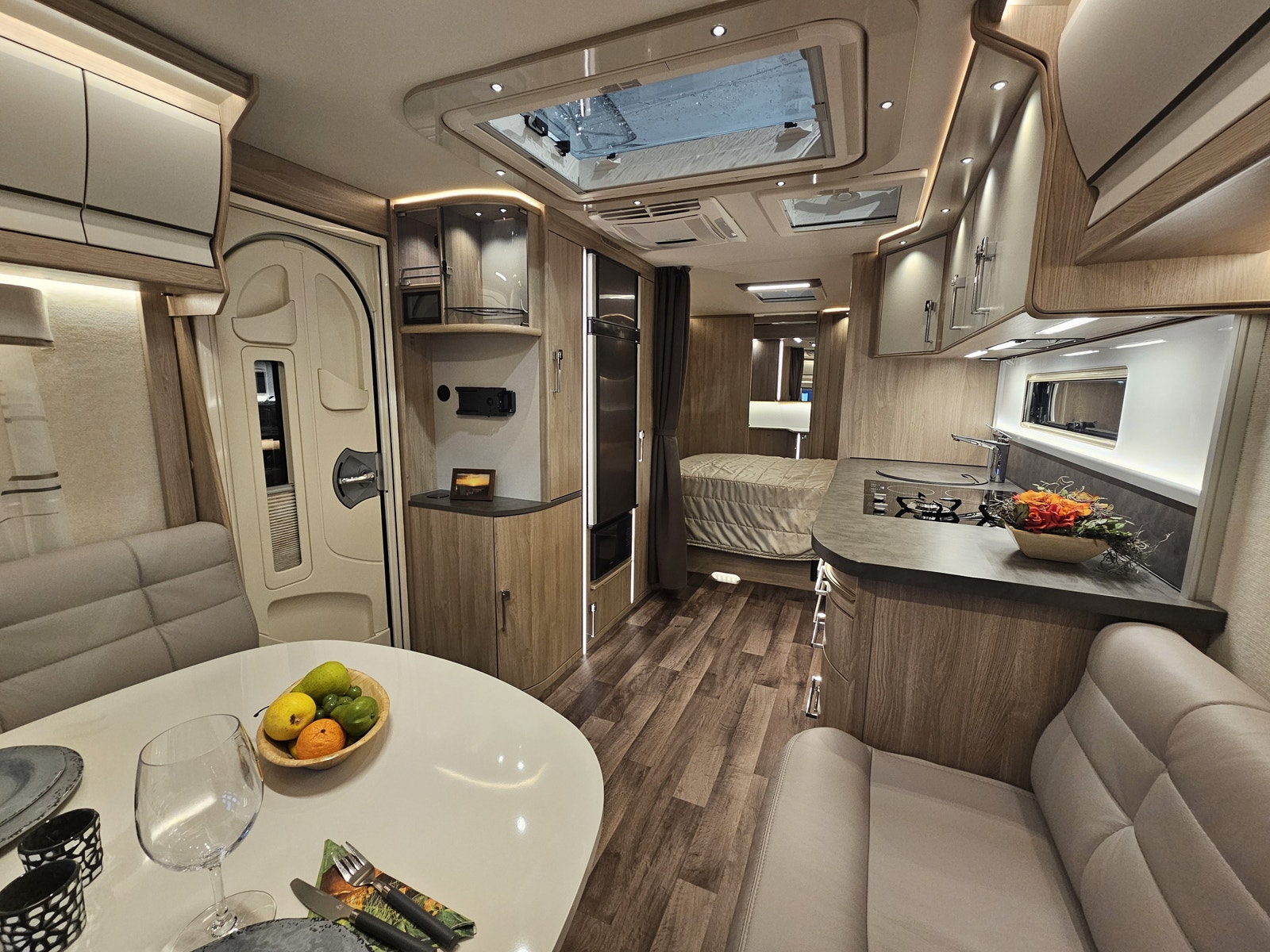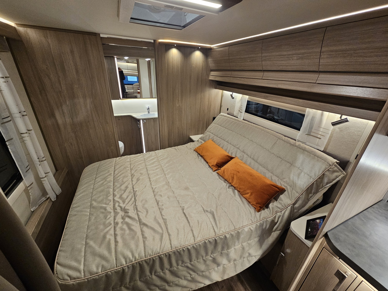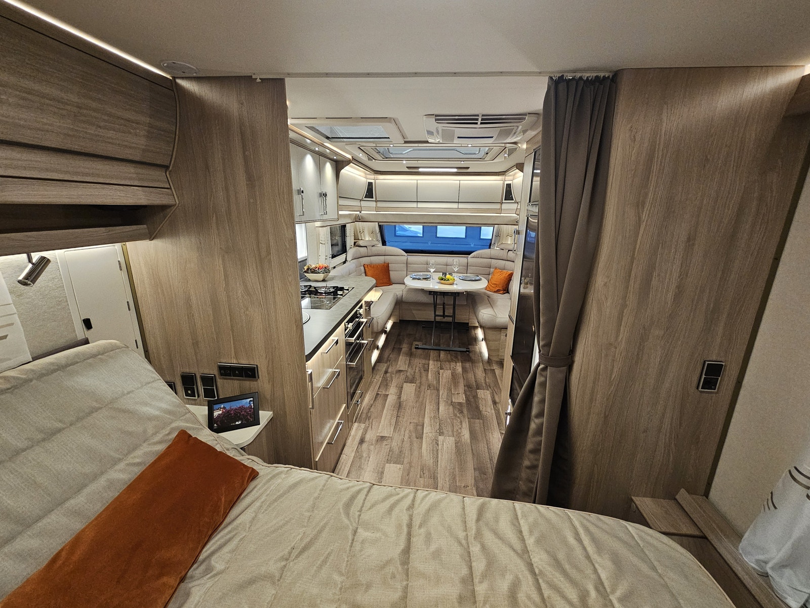 Denne campingvognen har en komfortabel queen size-seng som gir romslig plass til to personer – Stort bad på bakvegg med egen stor dusj samt en garderobeløsning. I tillegg kan sittegruppen enkelt omgjøres til ekstra sengeplasser, noe som gjør at vognen totalt kan huse opptil 4 personer.